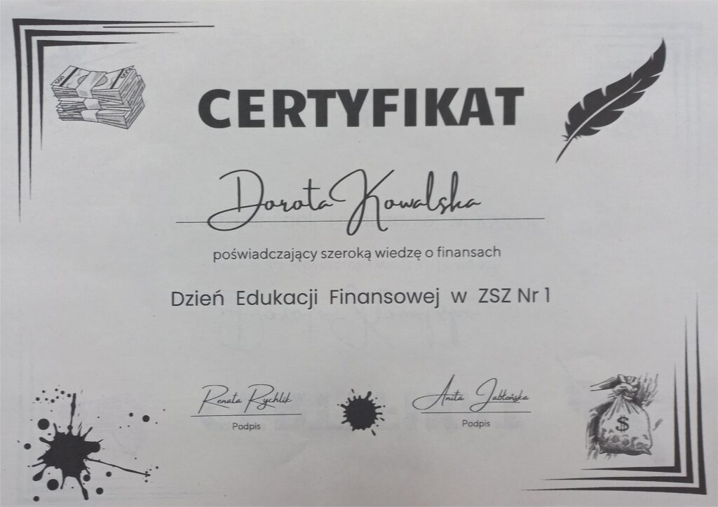 W ten dzień ekonomiści klasy III A i IV B pod patronatem p. Anity Jabłońskiej i p. Renaty Rychlik zorganizowali dla wszystkich chętnych Quiz na temat finansów oraz sondaż wśród uczniów i nauczycieli na temat wiedzy o finansach. Wszyscy uczestnicy otrzymali pamiątkowe Certyfikaty udziału w szczególnym Dniu Edukacji Finansowej.