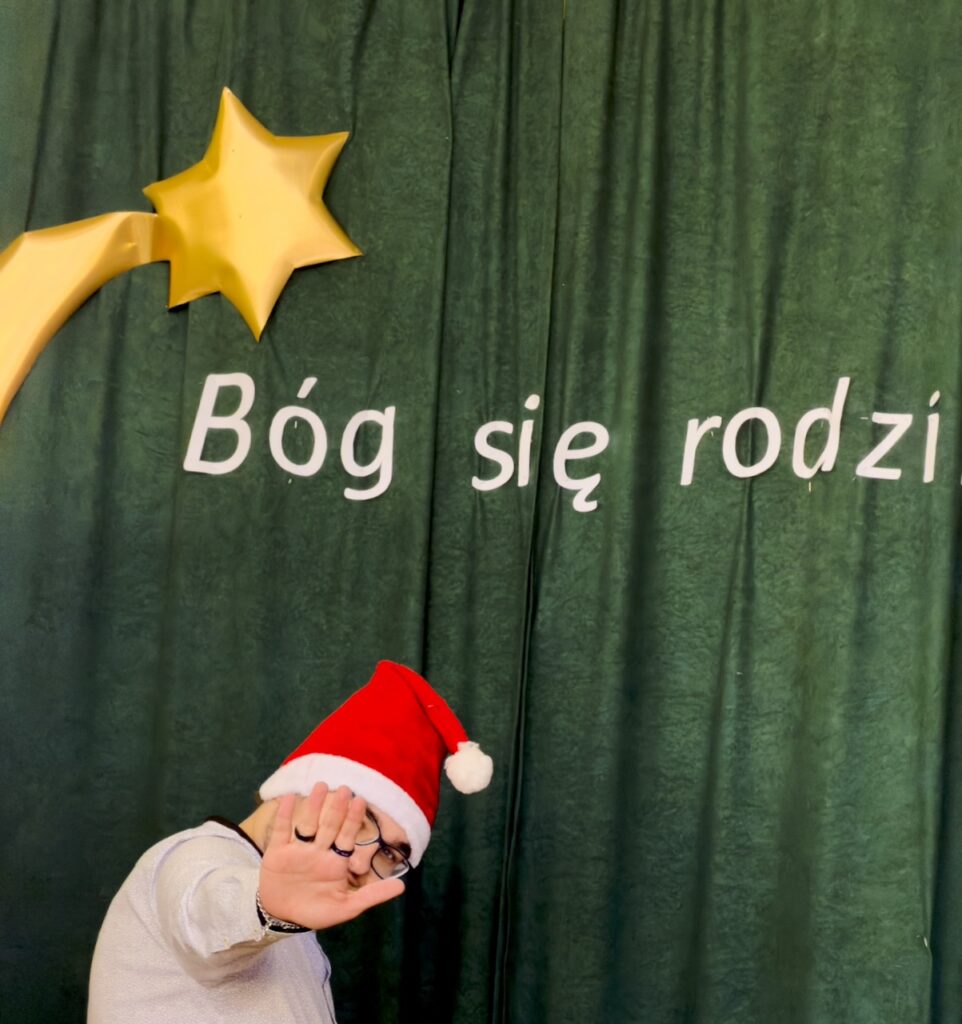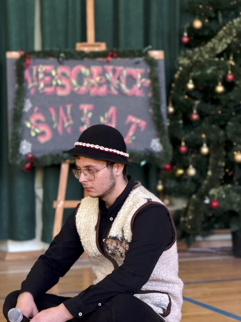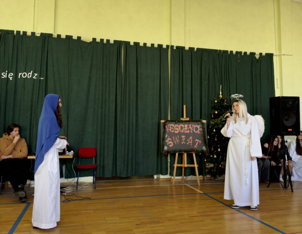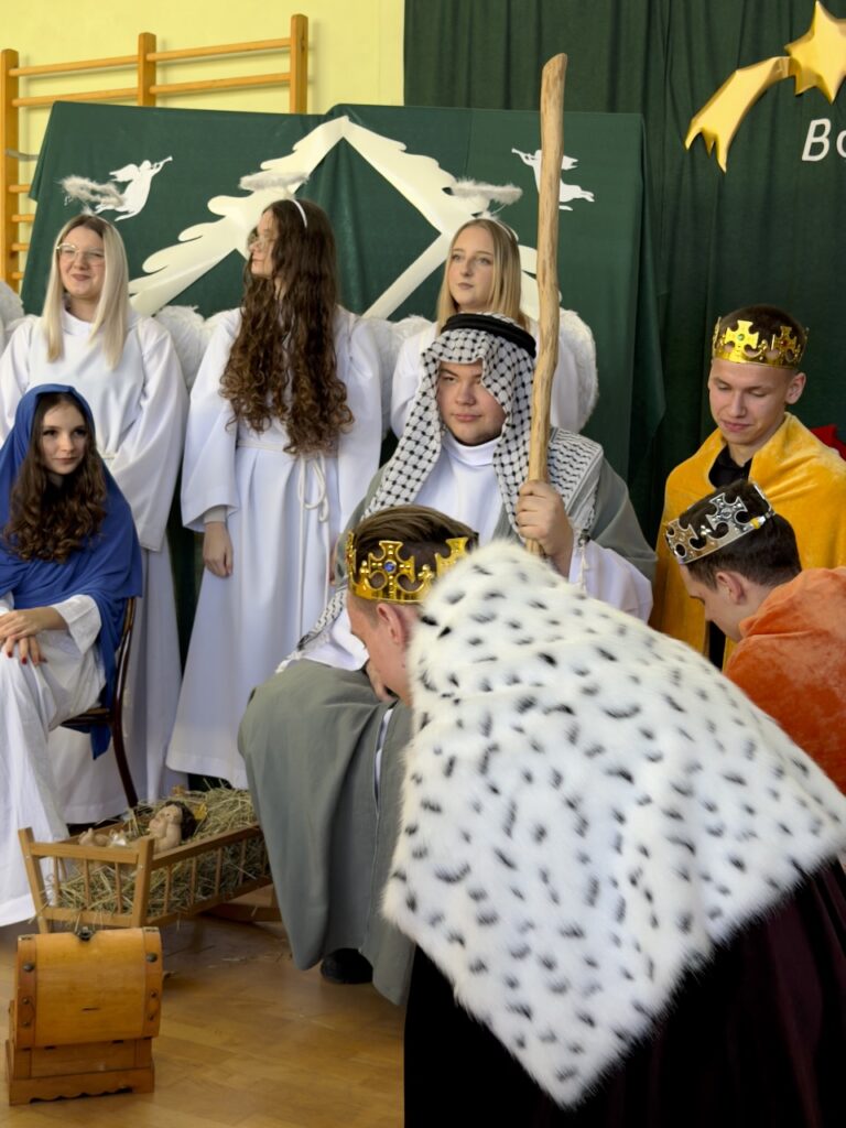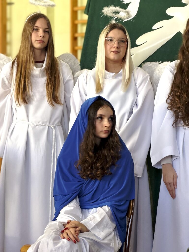 Sceny aktorskie przeplatane były pastorałkami i kolędami tworzącymi atmosferę drogich dni z Betlejem sprzed 2025 lat. Bardzo dziękujemy Majce Kani i Oliwii Doledze z 4a, Kindze Góźdź i Klaudii Wronie z 3c oraz Oliwii Wzorek za przepiękne aranżacje bożonarodzeniowych utworów.