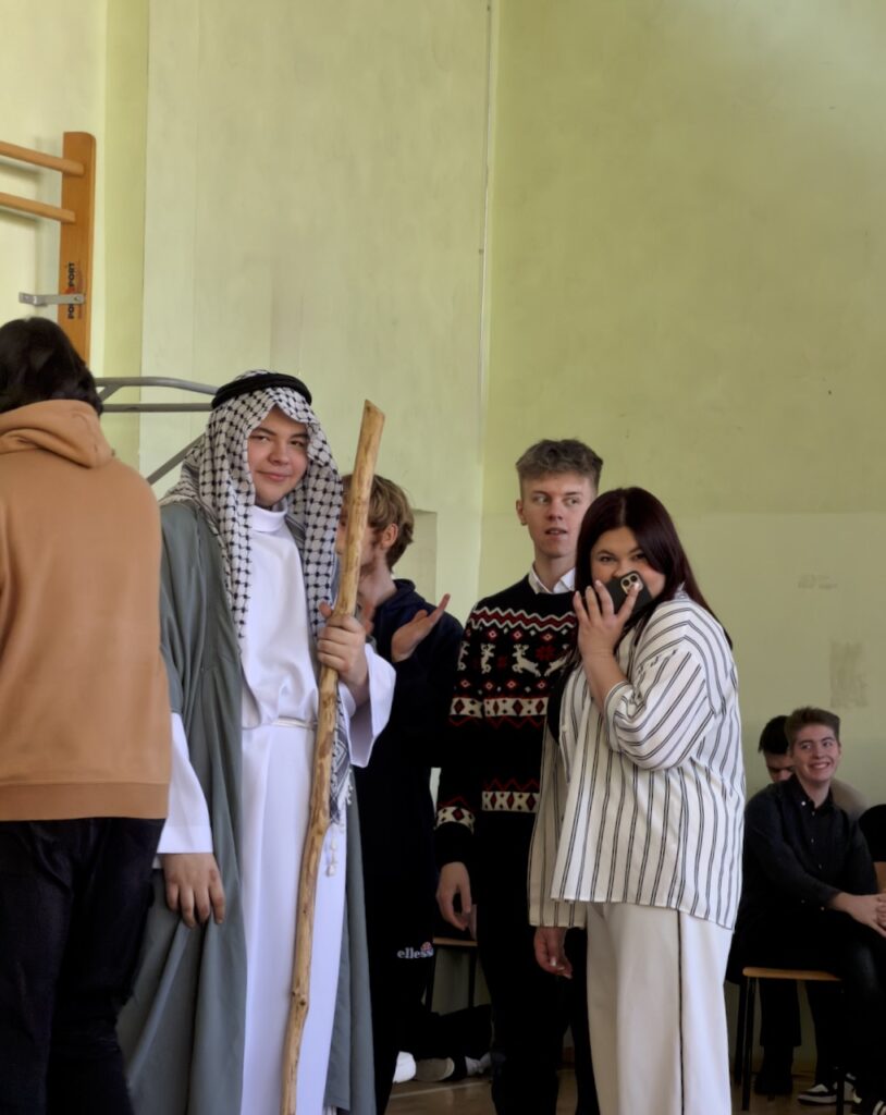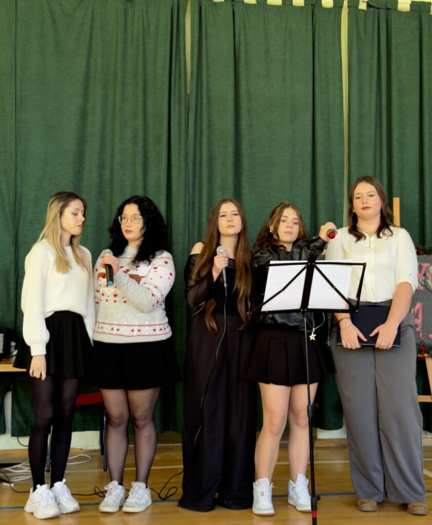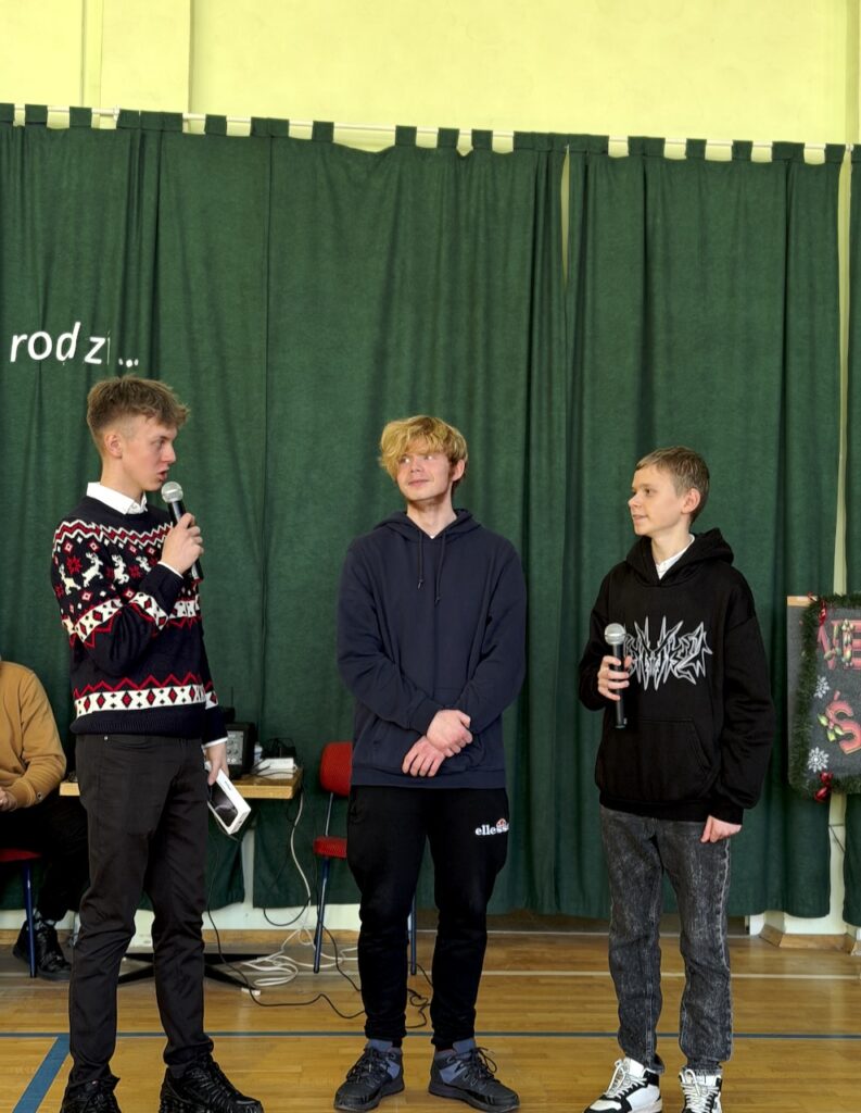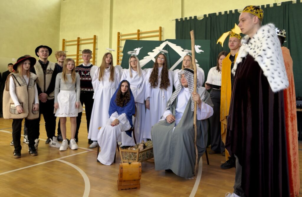 Sceny aktorskie przeplatane były pastorałkami i kolędami tworzącymi atmosferę drogich dni z Betlejem sprzed 2025 lat. Bardzo dziękujemy Majce Kani i Oliwii Doledze z 4a, Kindze Góźdź i Klaudii Wronie z 3c oraz Oliwii Wzorek za przepiękne aranżacje bożonarodzeniowych utworów.