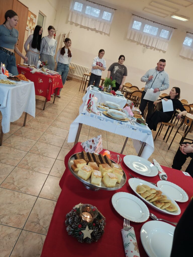 Uczestnicy konkursu, uczniowie z klas 2F, 3D, oraz z 3A, z ogromnym zaangażowaniem i pasją przygotowali wigilijne stoły, dbając o każdy detal. Na stołach pojawiły się tradycyjne potrawy wigilijne, pięknie udekorowane nakrycia, świąteczne serwetki, stroiki oraz symboliczne elementy nawiązujące do polskich tradycji.