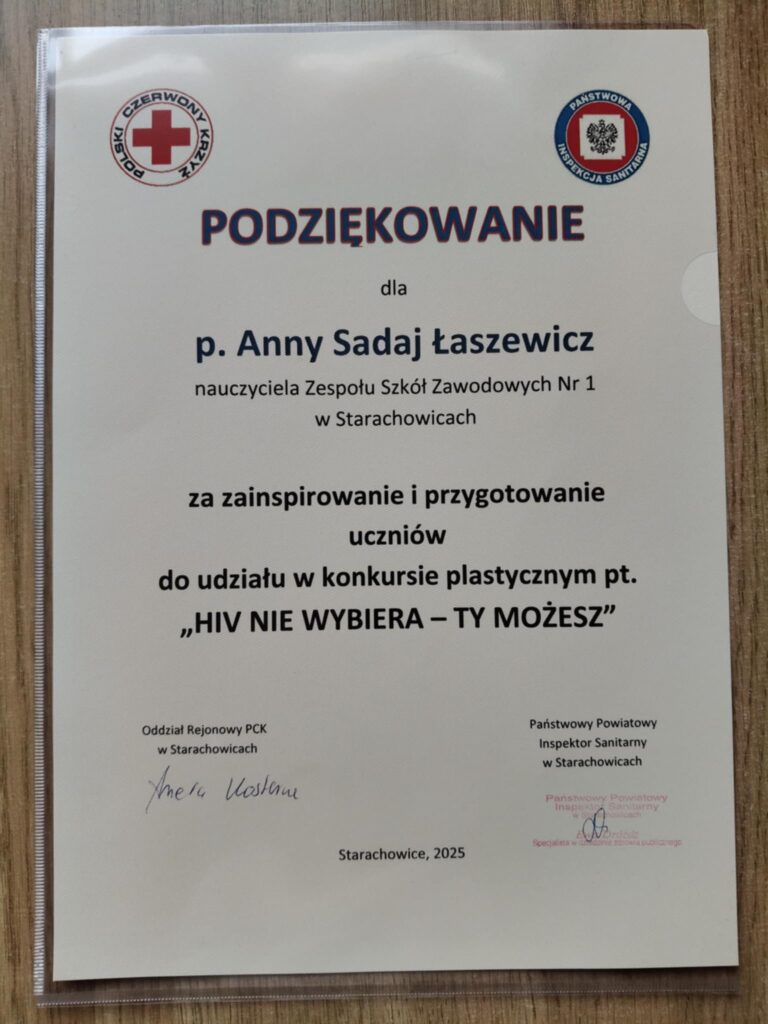 Gratulacje dla Anny Huzei, uczennicy kl. 1 B, która została wyróżniona w konkursie plastycznym pt. „HIV nie wybiera- Ty możesz”. Opiekunem Ani była p. Anna Sadaj -Łaszewicz. Organizatorami konkursu byli: Oddział Rejonowy PCK w Starachowicach i Państwowy Powiatowy Inspektor Sanitarny w Starachowicach. Wyróżnienie oraz nagroda zostały wręczone podczas konferencji profilaktycznej w dniu 3 grudnia 2025 r. w sali konferencyjnej Olimpia przy Urzędzie Miasta w Starachowicach.