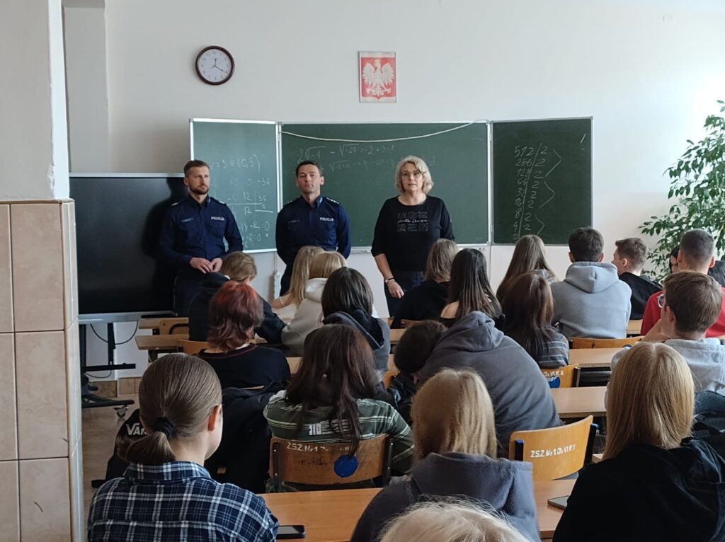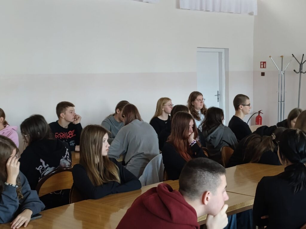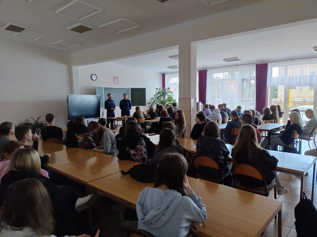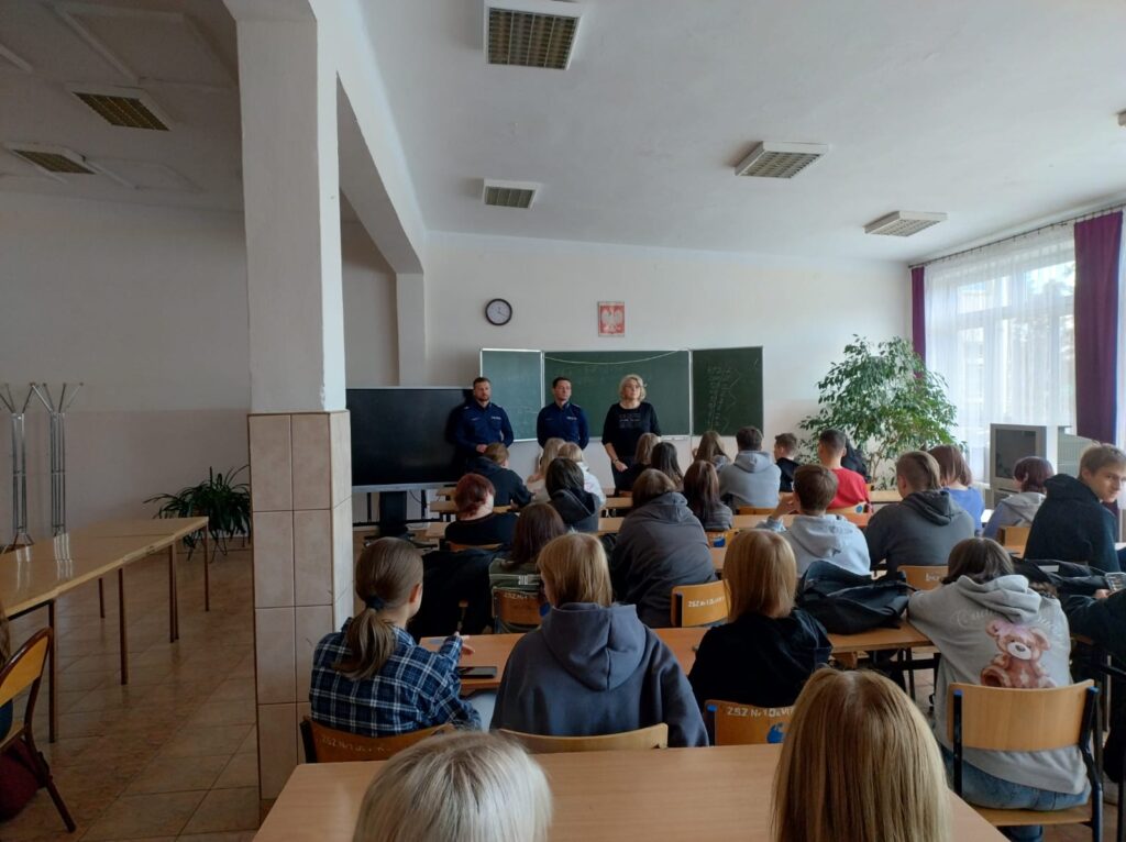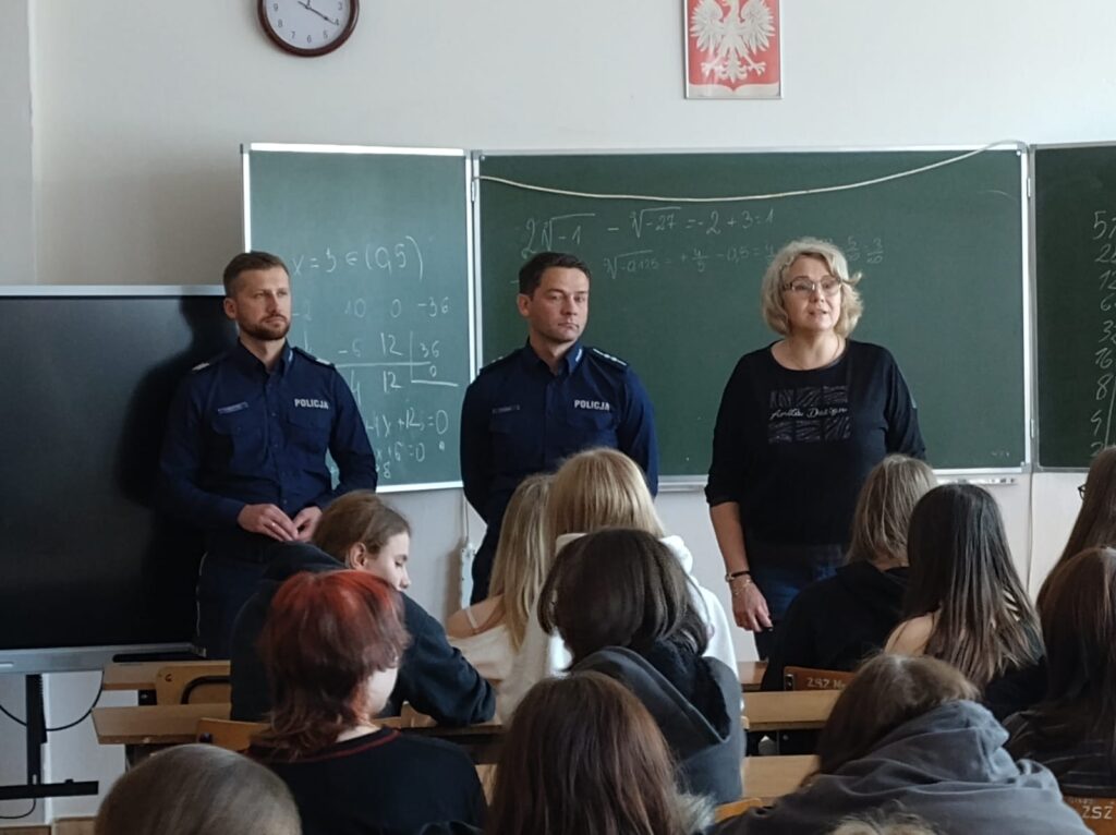 15 października 2025 r. na zaproszenie Zespołu Wychowawczego, przybyli do naszej szkoły specjaliści z Komendy Powiatowej Policji zajmujący się profilaktyką i prewencją. Przeprowadzili oni zajęcia edukacyjne z uczniami w ramach realizowanego w szkole programu profilaktycznego w zakresie przeciwdziałania przemocy rówieśniczej i skutków tego zjawiska. Prelegenci omówili dogłębnie zagadnienia dotyczące cyberprzemocy wśród młodzieży  oraz konsekwencji prawnych dla osób nieletnich w sytuacji zachowań przemocowych. Odbiorcami ważnego przekazu byli uczniowie klasy 1 a, 1 b, oraz 2 f i 2 g wraz z nauczycielami. Z zainteresowaniem, w skupieniu społeczność szkolna wysłuchała ciekawych i pouczających treści.