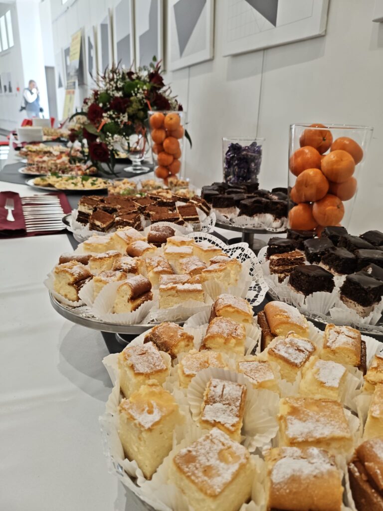 Na stołach królowały smakowite koreczki, sałatki w finger foodach, babeczki z sałatką, roladki z łososiem, w tortilli – wszystko pięknie udekorowane i podane z niezwykłą starannością. Nie zabrakło również aromatycznej kawy, herbaty oraz słodkich wypieków.
