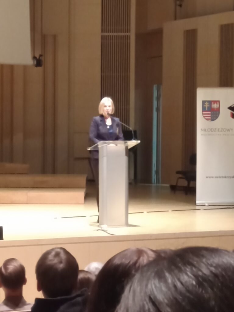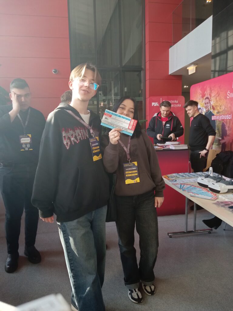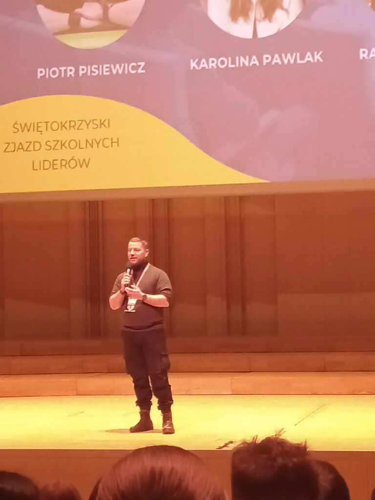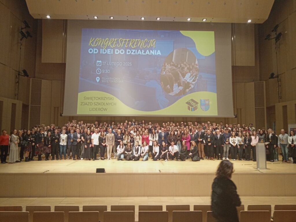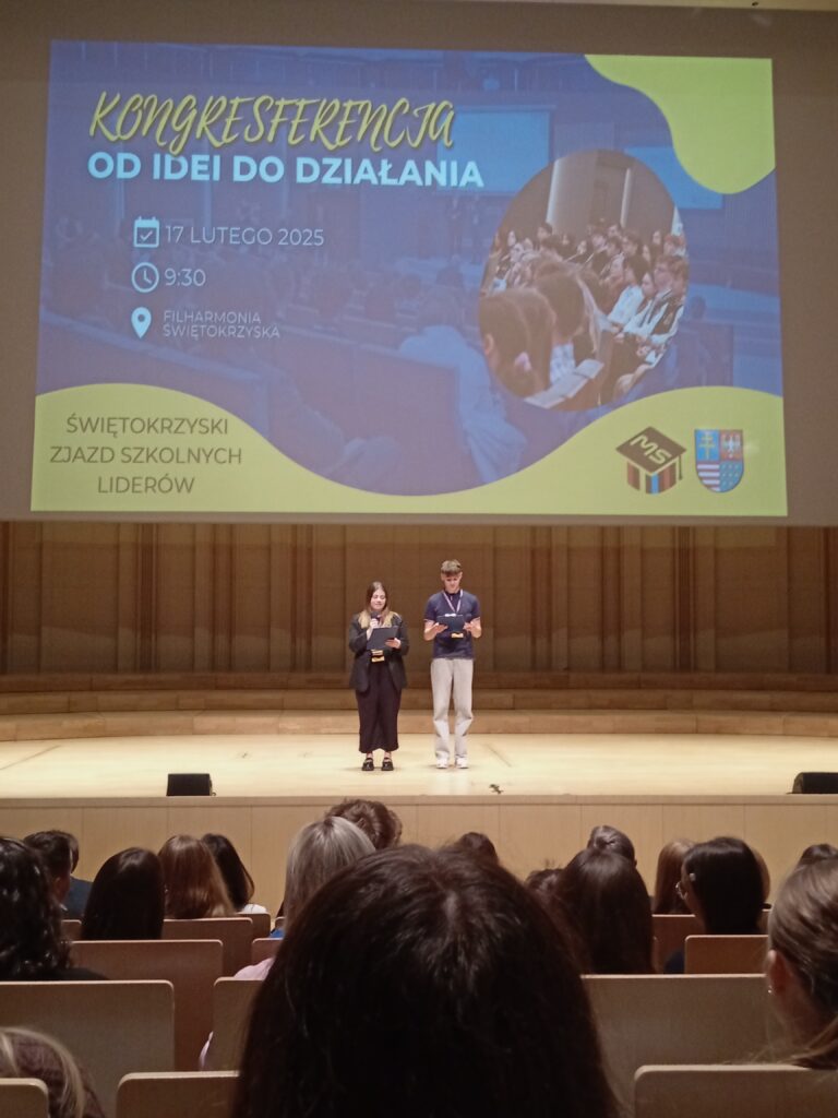 Reprezentanci Samorządu Uczniowskiego: Natalia Bałtowska z kl. 3a  i  Bartłomiej Loranty z kl. 4a wraz z opiekunem SU uczestniczyli w dniu 17.02.2025 r. w Kongresferencji ”Od idei do działania – Świętokrzyski zjazd szkolnych liderów” zorganizowanej przez Młodzieżowy Sejmik wraz z Samorządem Województwa Świętokrzyskiego. Spotkanie rozpoczęła prezes Stowarzyszenia Creativity Works Europe p. Kama Kępczyńska prelekcją „Weźże się zaangażuj! O aktywnościach w pięciu językach”. Podczas kongresferencji  nasi uczniowie wzięli udział w warsztatach i panelach dyskusyjnych z udziałem ekspertów.  W programie  nie zabrakło również warsztatów dla opiekunów SU.  Swoje stoiska  zaprezentowały również instytucje publiczne i organizacje pozarządowe (m.in. ŚCDN, UJK, Politechnika Świętokrzyska, WUP, Miasto Kielce), które przedstawiały swoją ofertę aktywności i projektów skierowanych do młodych ludzi.