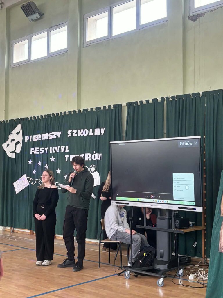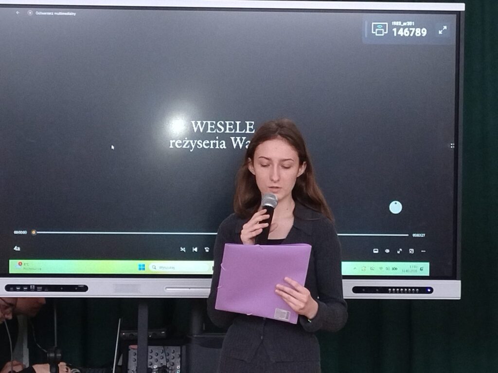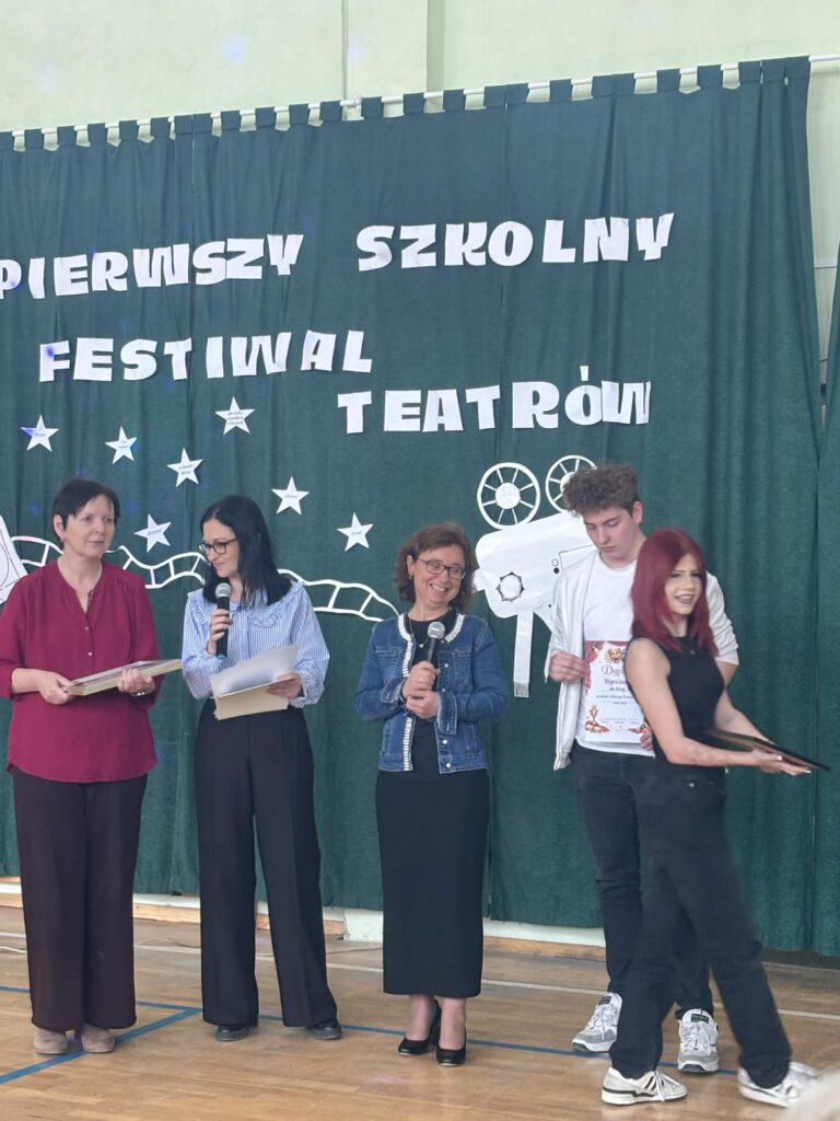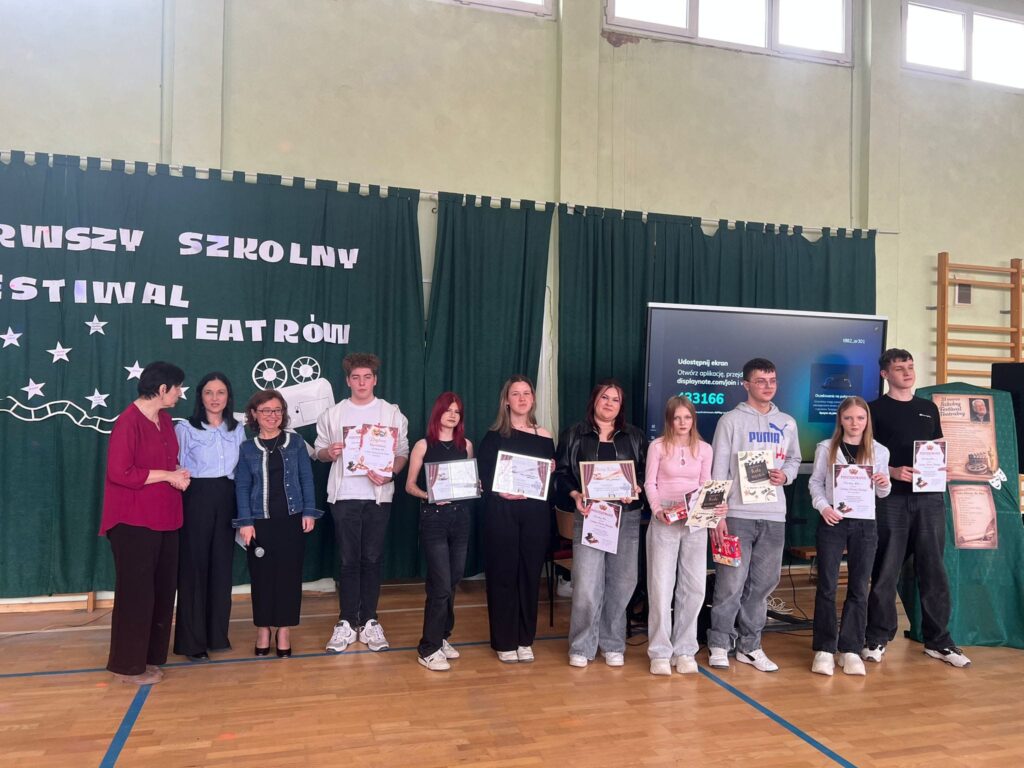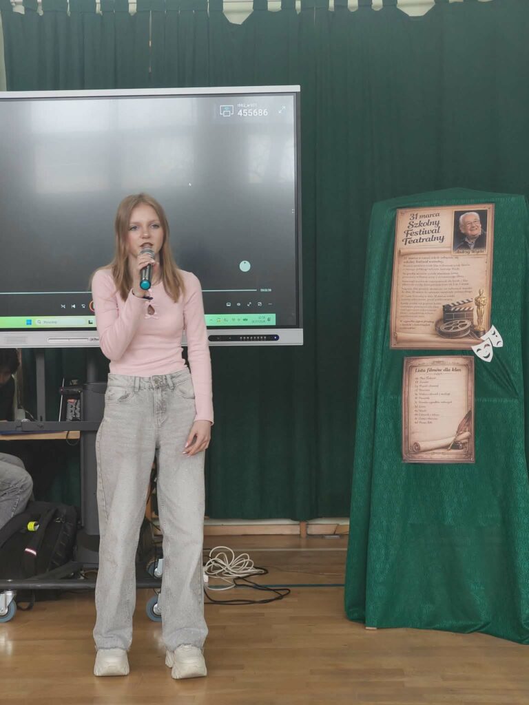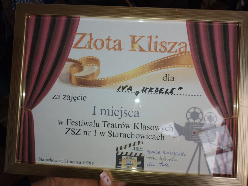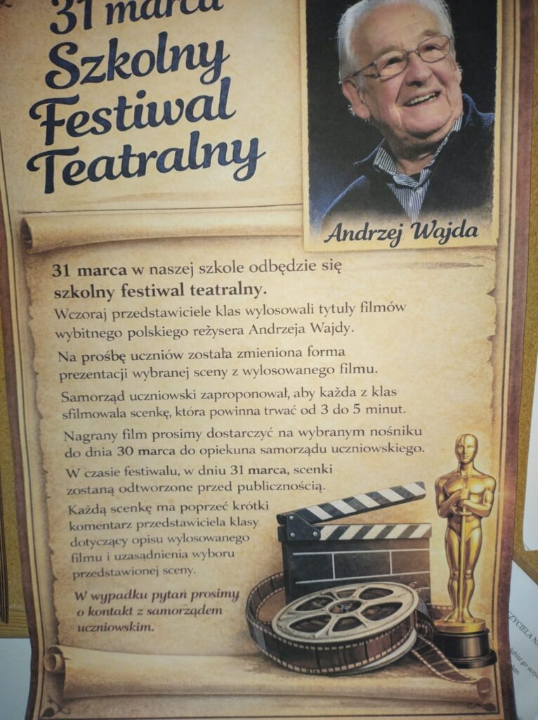 31 marca 2026 r. odbył się w naszej szkole Szkolny Festiwal Teatralny. Motywem przewodnim była twórczość wybitnego polskiego reżysera Andrzeja Wajdy. Nieprzypadkowo młodzież przyjrzała się bliżej jego dokonaniom artystycznym. Z inicjatywy Senatu Rzeczypospolitej Polskiej rok 2026 został ogłoszony Rokiem Andrzeja Wajdy.  To świetna okazja i właściwy moment, by powrócić do twórczości mistrza i spojrzeć na jego filmy świeżym okiem.  Uczniowieposzczególnych klas mieli za zadanie zaprezentować scenę z wylosowanego filmu.  Na ich prośbę została zmieniona forma prezentacji z teatralnej na filmową. We wtorek mieliśmy okazję podziwiać efekty pracy naszej wspaniałej młodzieży. Jury w składzie: pani wicedyrektor Monika Maciejczak, pani Aneta Bykowska i pani Anna Tota wyłoniło zwycięzców. Pierwsze miejsce i Złotą Kliszę zdobyła klasa 4 a, która zaprezentowała sceny z „Wesela”. Drugie miejsce zajęła klasa 4 b z sugestywną interpretacją scen z filmu „Człowiek z żelaza” , zdobywając tym samym Srebrną Kliszę. Brązową Kliszę otrzymała klasa 1 a, która przedstawiła sceny z „Pana Tadeusza”.  Były też wyróżnienia za najlepszą rolę kobiecą i męską. W pierwszej kategorii jury doceniło Ulianę Hladkovą z klasy  2 f.  Najlepszym aktorem został Konrad Wrzesień z klasy 4 b.