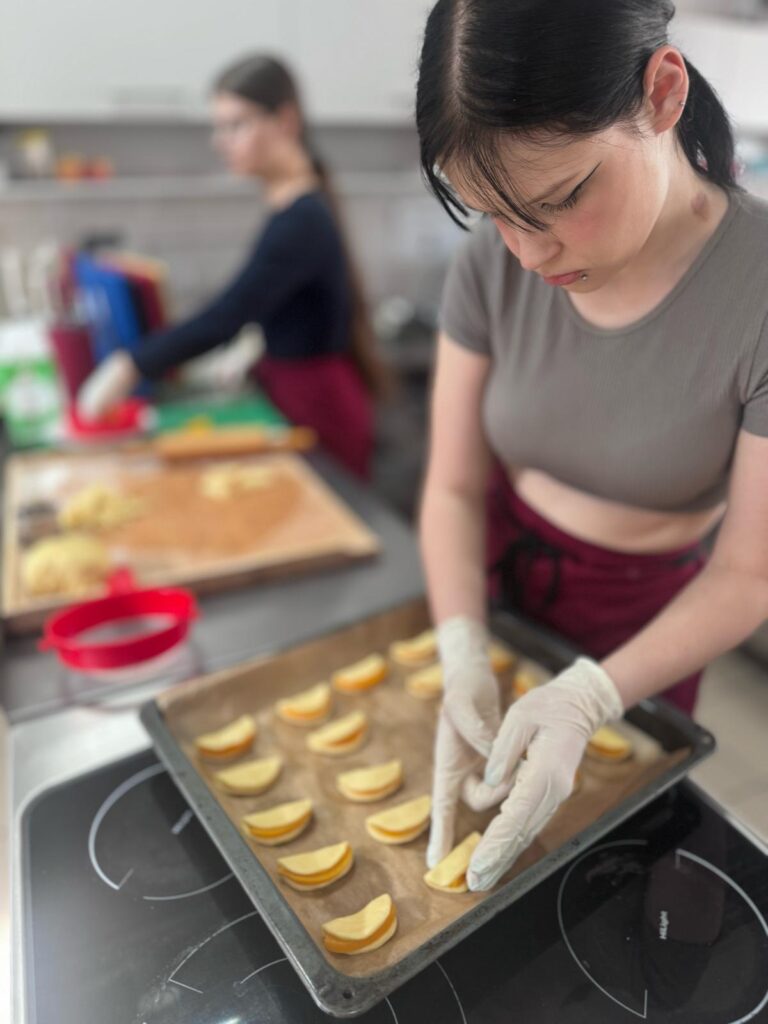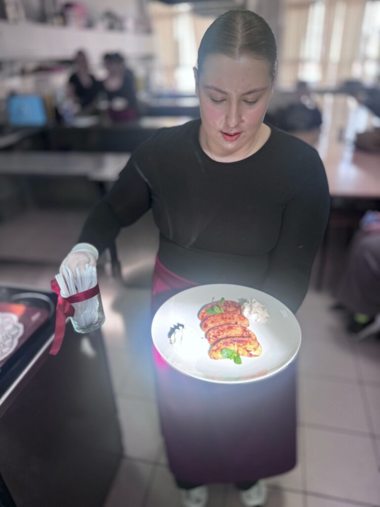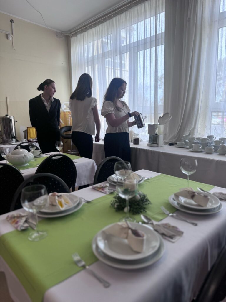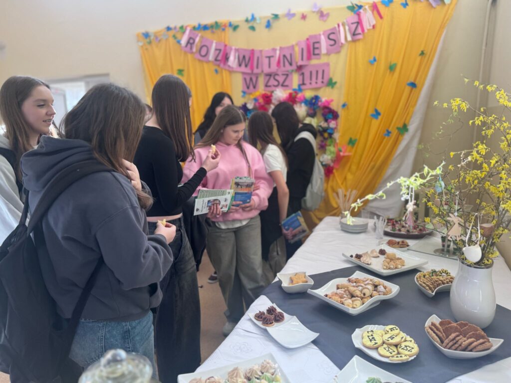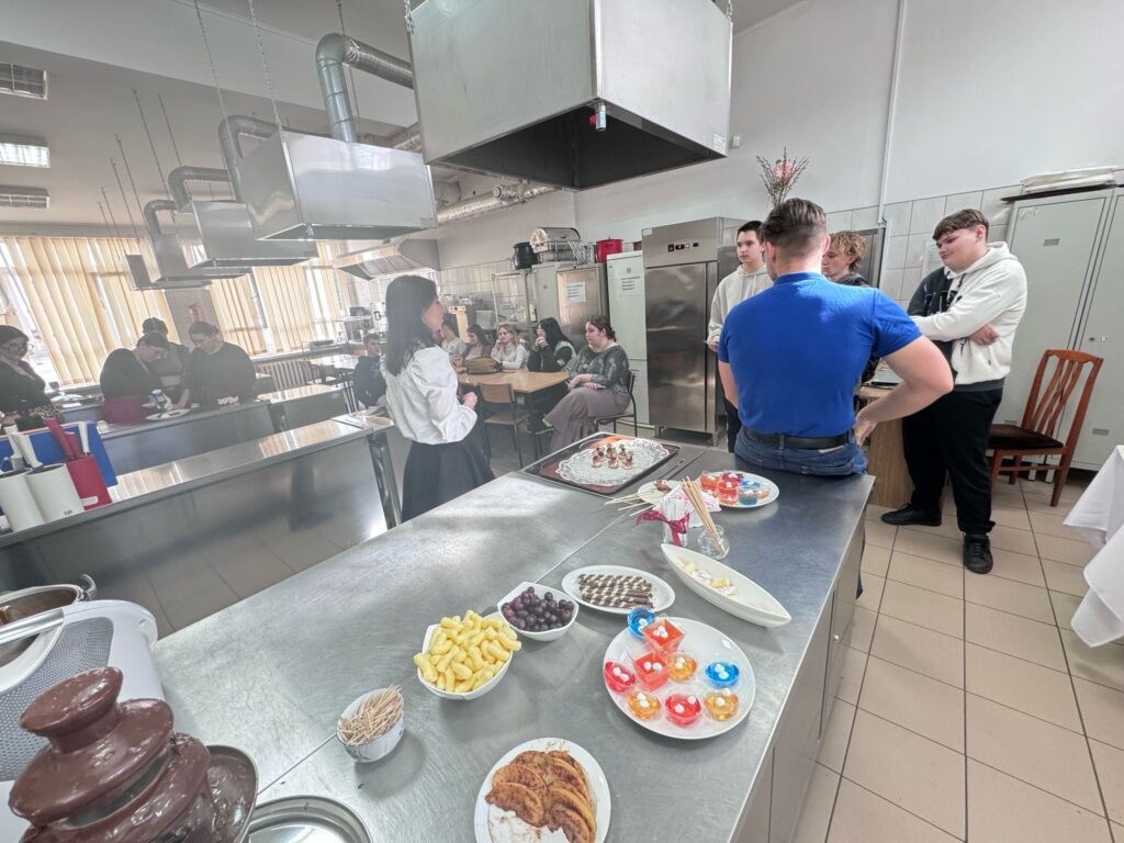 Nasi uczniowie na holu głównym szkoły witali przybyłych gości i kierowali ich do sali obsługi konsumenckiej, gdzie czekał na nich słodki poczęstunek i krótkie powitanie przez naszych nauczycieli i Dyrekcję ZSZ nr 1. Poczęstunek przygotowali uczniowie kształcący się w zawodzie technika żywienia i usług gastronomicznych, pod czujnym okiem nauczycieli przedmiotów gastronomicznych.
