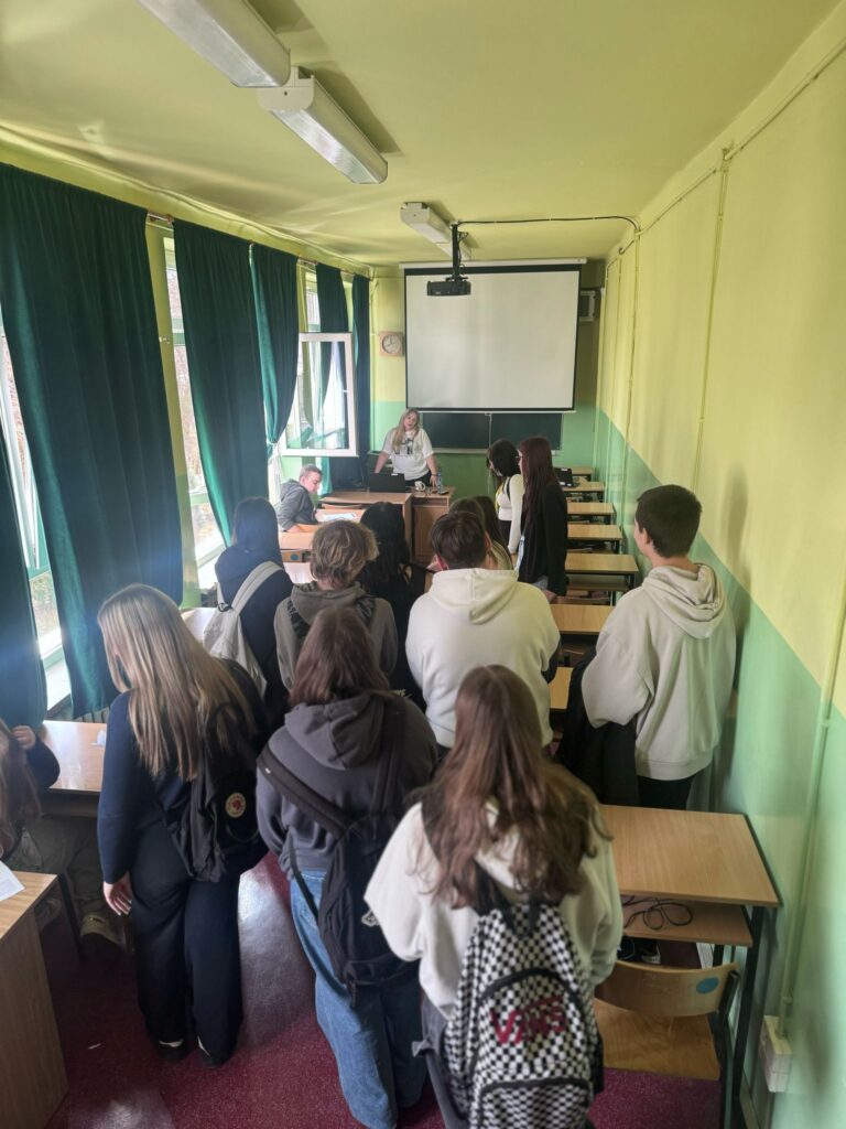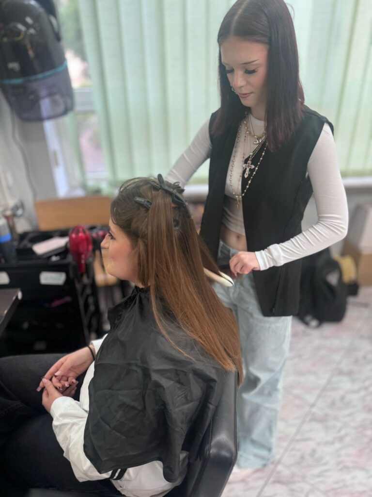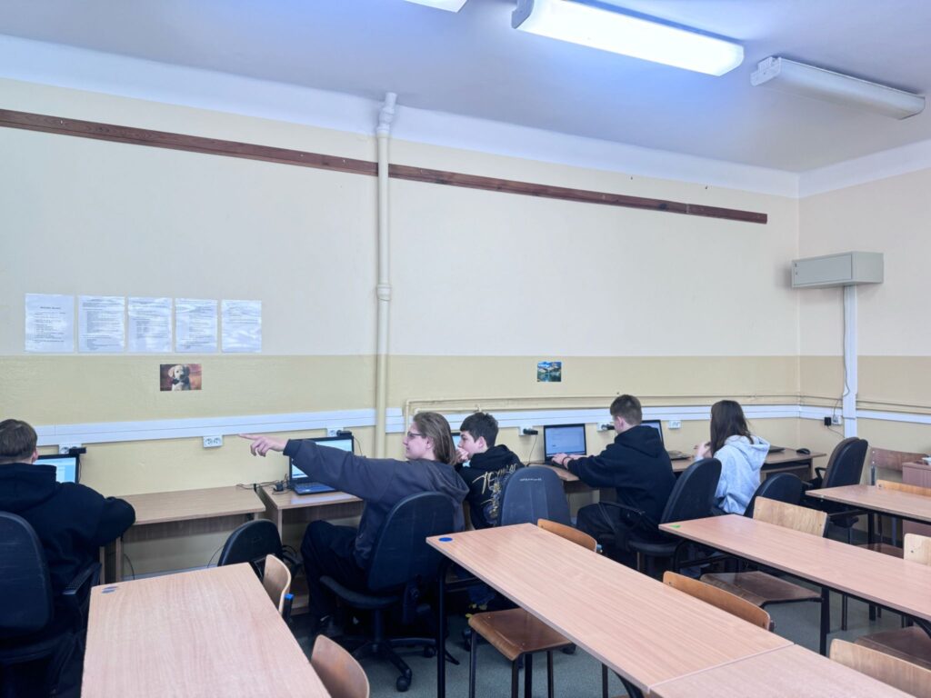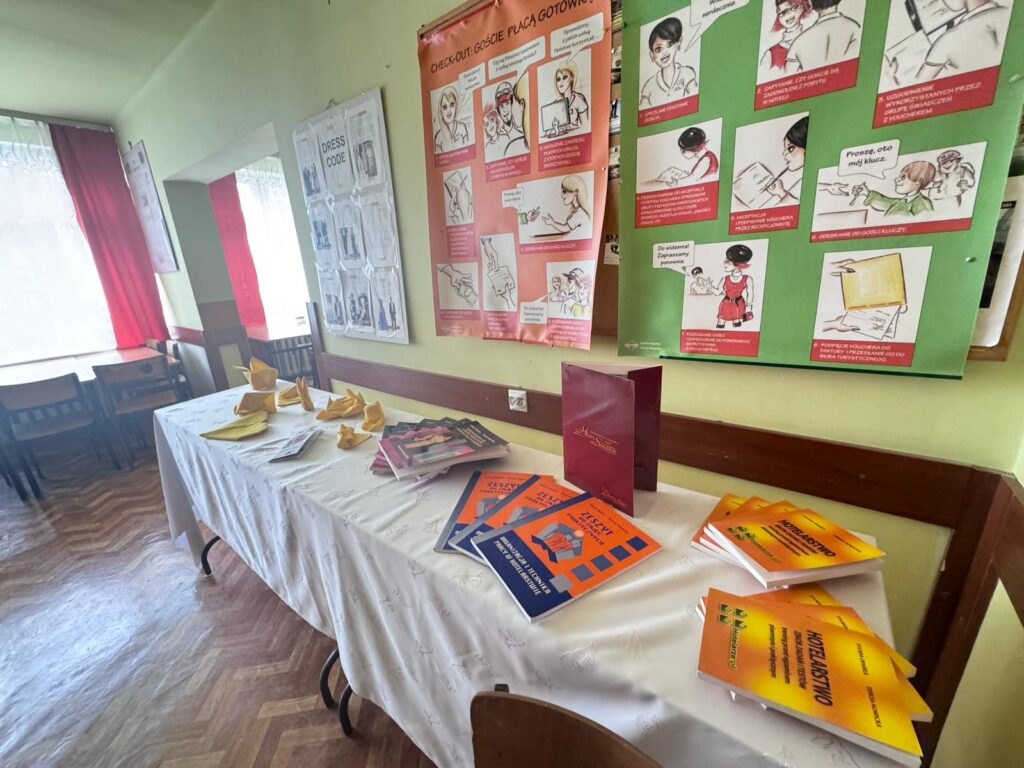 Następnie nasi uczniowie-przewodnicy oprowadzali gości po szkole, pokazując im pracownie, sale lekcyjne i specjalistyczne – 4 pracownie komputerowe wyposażone w oprogramowania komputerowe wykorzystywane w kształceniu technika ekonomisty, technika rachunkowości, technika handlowca, technika geodety, technika architektury krajobrazu i technika hotelarstwa, pracownię gastronomiczną, pracownię obsługi konsumenta, pracownie fryzjerskie w których kształcą się technicy usług fryzjerskich oraz pracownie techników chłodnictwa i klimatyzacji.