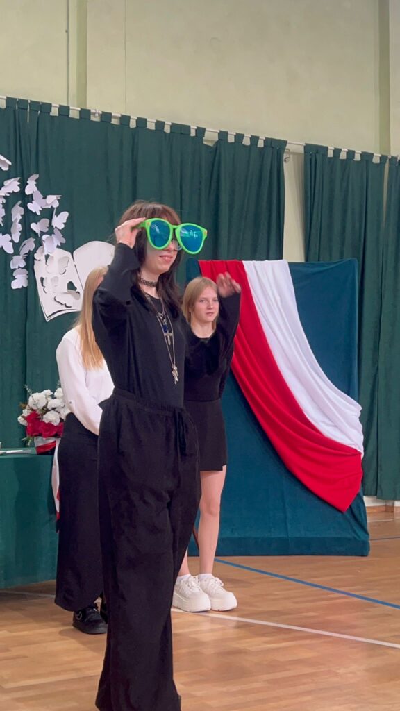 Następnie młodzież z klasy II f i II g zaprezentowała program artystyczny przygotowany pod kierunkiem wychowawców : p. Marzeny Cieśli – Cywki i p. Agnieszki Urbańczyk. Utwory wokalne wykonała uczennica klasy V b Martyna Wiecha .