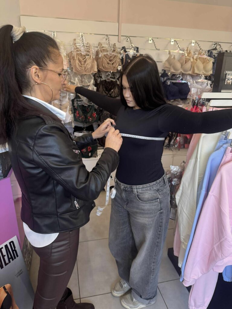 W dniu 26.09.2025 r. nasze „stylistki” z klasy i b wraz z p. Aneta Sałek odwiedziły salon z bielizną „Isabell”, w którym brafitterka p. Izabela Nowak z dużym zaangażowaniem i ciepłem, pokazała i wytłumaczyła uczennicom kształcącym się w zawodzie technik stylista, jak prawidłowo dobrać biustonosz. Właściwie dobrana ta część bielizny poprawia wygląd oraz pomaga w modelowaniu sylwetki. Uczennice z zainteresowaniem wysłuchały informacji przekazanych przez profesjonalną brafitterkę. Miały okazję samodzielnie dokonać pomiarów i na ich podstawie dobrać właściwy rozmiar bielizny.