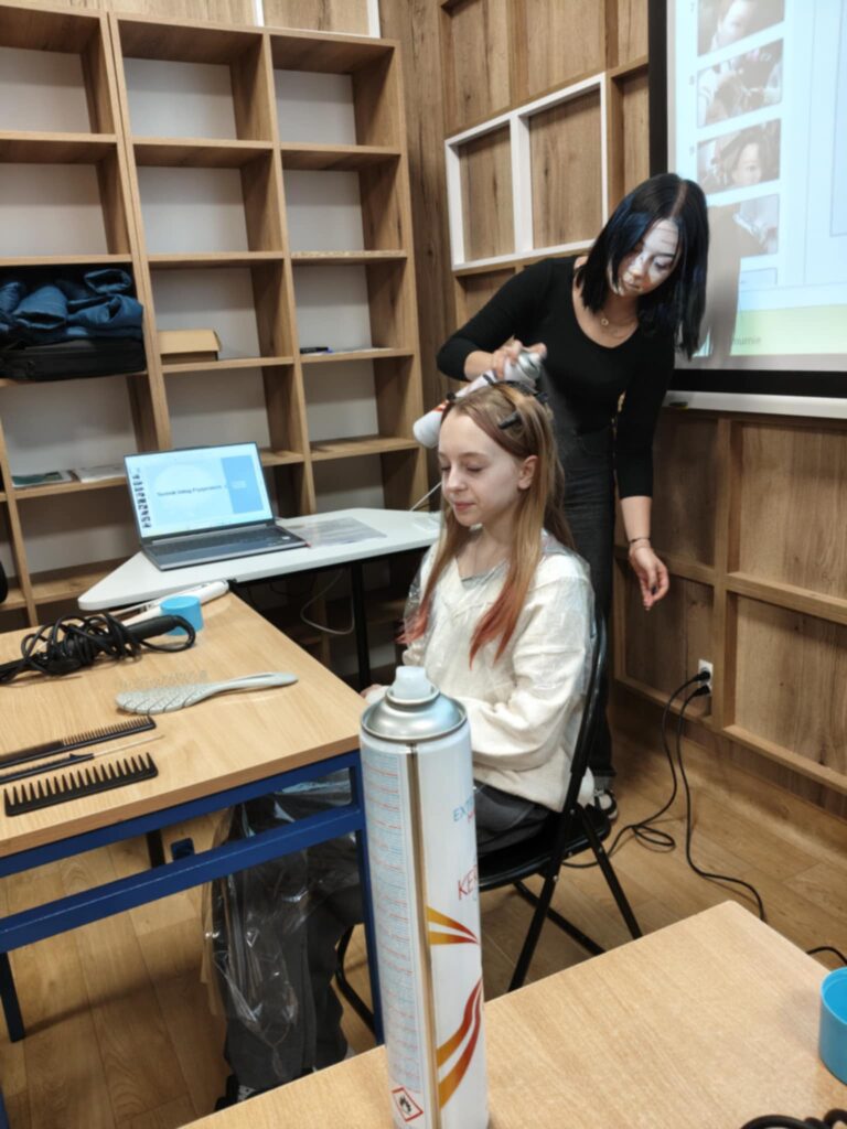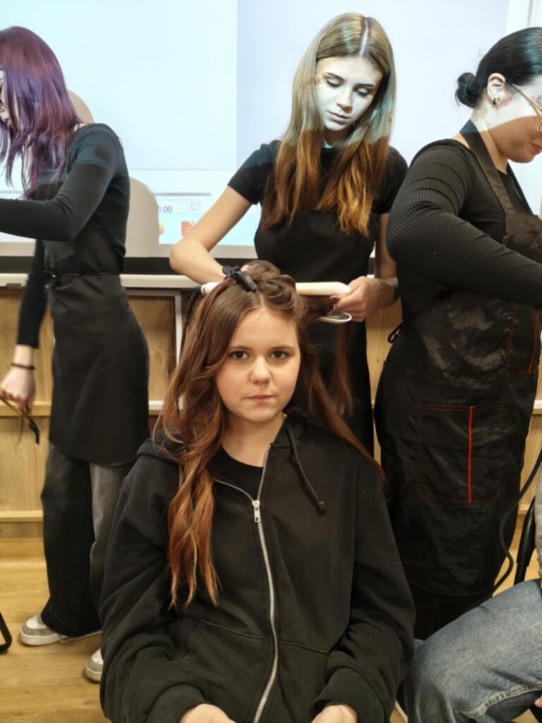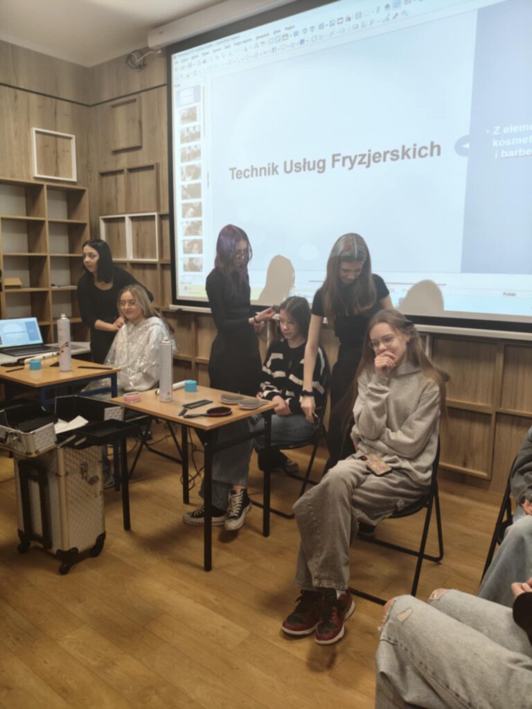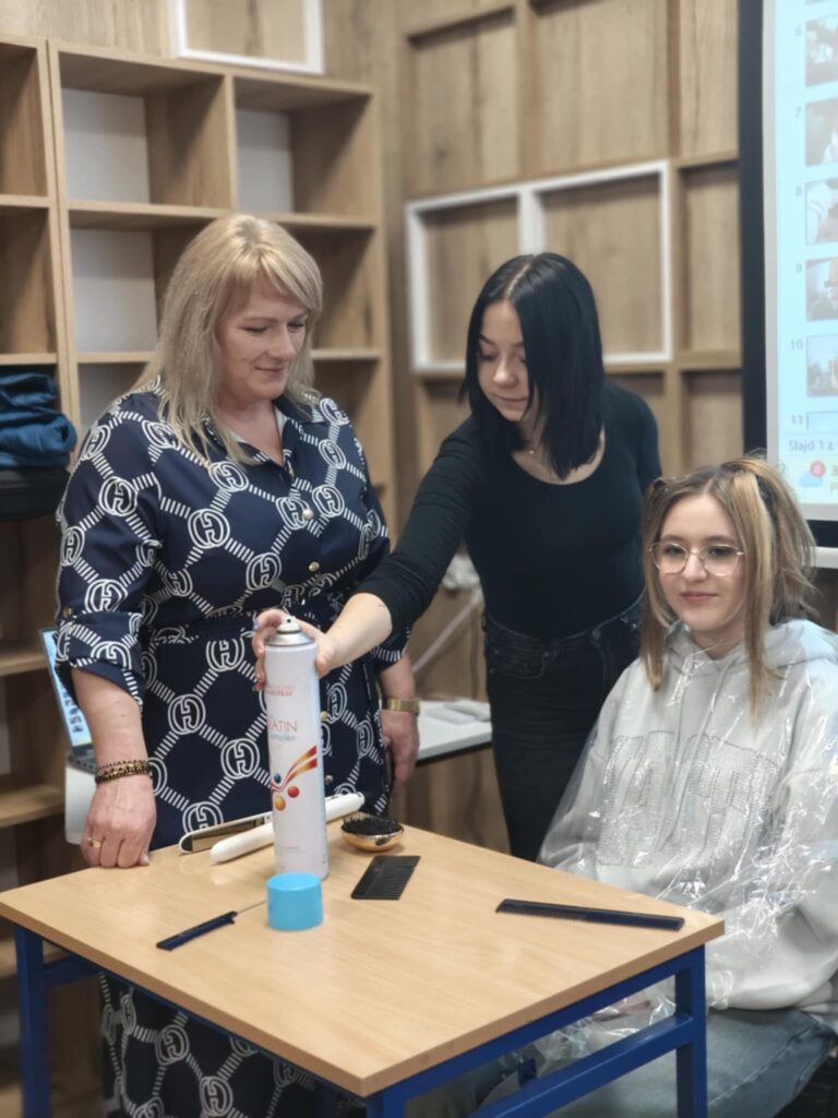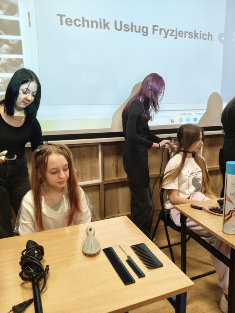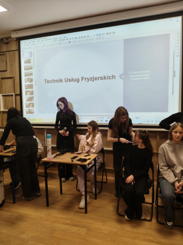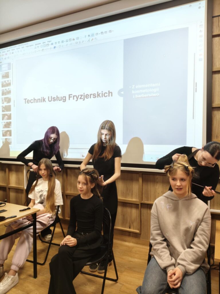 Uczniowie kształcący się w zawodzie Technik Usług Fryzjerskich w Zespole Szkół Zawodowych nr 1 z opiekunami p. wicedyrektor Anną Sadaj-Łaszewicz oraz nauczycielami przedmiotów fryzjerskich p. Edytą Borowiec i p. Anetą Sałek w dniu dzisiejszym odwiedzili młodzież w Szkole Podstawowej nr 11 w Starachowicach. Uczennice klasy 6, 7 i 8 poddały się zabiegom upiększającym włosy i pielęgnacyjnym dłoni. Efektem były piękne fryzury, delikatne makijaże oraz dłonie, na których wykonano peeling z kawy, oliwy i cukru trzcinowego. Uczennice z technikum nauczyły młodsze koleżanki jak wykonać maseczkę odżywczo-pielęgnacyjną na włosy z wykorzystaniem żółtka jaja, oliwy i soku z cytryny. Tak przygotowaną maseczkę dziewczynki zabrały do wykorzystania w domu. Spotkanie w murach SP 11 było okazją do zaprezentowania oferty kształcenia w ZSZ nr 1 ze szczególnym przybliżeniem dwóch zawodów: Technika Usług Fryzjerskich z elementami kosmetologii i barberstwa oraz Technika Stylisty z elementami wizażu i kreowania wizerunku w social mediach.